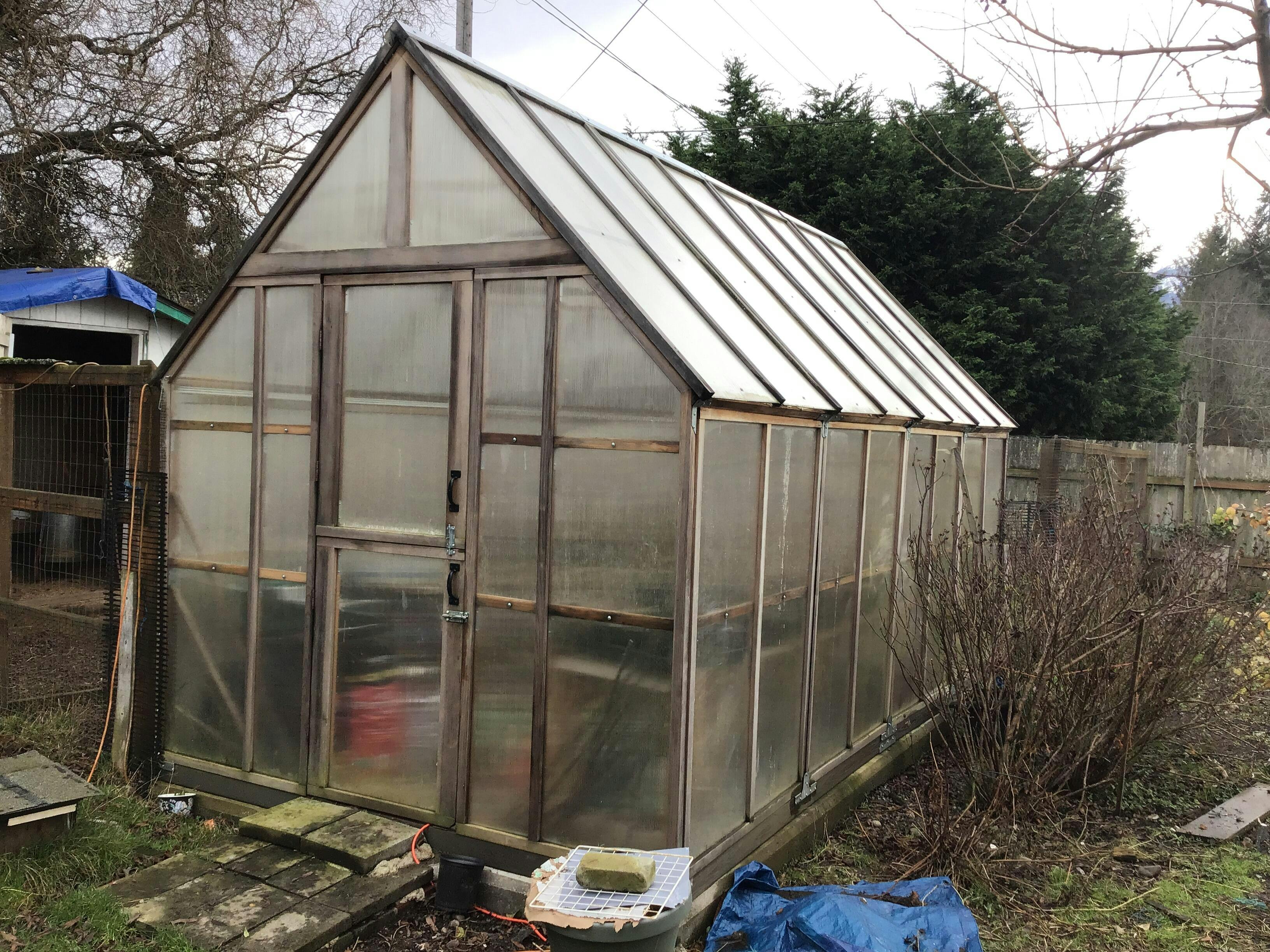 The 45-degree roof slope transmits low-angle sun in the winter and reflects high-angle sun in summer. This increases heat in the winter and reduces it in the summer. It also provides ample headroom and plant-hanging space. The steep roof slope sheds snow in the winter and can withstand a snow load of 18 lbs. per square foot.
